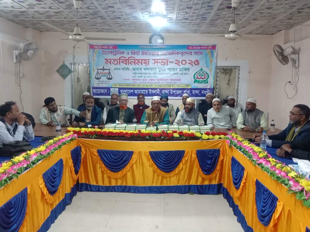 নওগাঁ প্রতিনিধিঃ নওগাঁর মান্দায় ইলেককট্রনিক ও প্রিন্ট মিডিয়ার সাংবাদিকবৃন্দের সাথে মতবিনিময়সভা অনুষ্ঠিত হয়েছে। শুক্রবার সন্ধ্যায় বাংলাদেশ জামায়াতে ইসলামী মান্দা উপজেলা শাখার দলীয় কার্যালয়ে এ মতবিনিময় সভা অনুষ্ঠিত হয়। এসময় বাংলাদেশ জামায়াতে ইসলামী মান্দা উপজেলা শাখার সহকারী সেক্রেটারি ইলিয়াস খান এর সঞ্চলনায় ও আমীর ডা. আমিনুল ইসলামের সভাপতিত্বে মতবিনিময় সভায় প্রধান অতিথি হিসেবে বক্তব্য রাখেন, কেন্দ্রীয় মজলিসে সূরা সদস্য,বাংলাদেশ জামায়াতে ইসলামী নওগাঁ জেলা শাখার আমীর ও জামায়াত মনোনীত সংসদ সদস্য পদপ্রার্থী খন্দকার মুহাঃ আব্দুর রাকিব। এসময় বিশেষ অতিথি হিসেবে বক্তব্য রাখেন, সাংবাদিক নজরুল ইসলাম,রেজাউল ইসলাম ও কাজী কামাল হোসেন প্রমূখ।