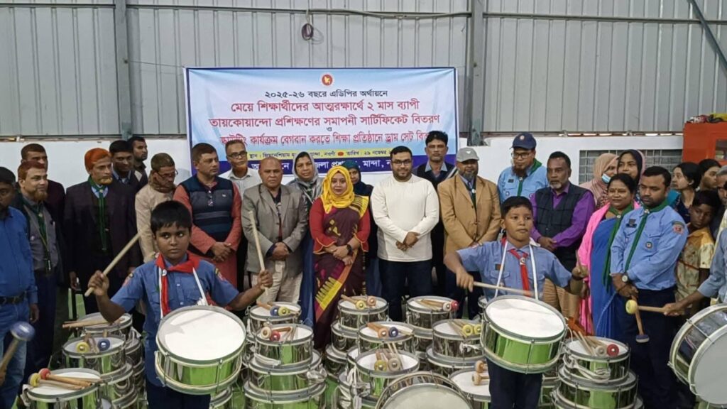 নওগাঁ প্রতিনিধিঃ নওগাঁর মান্দায় এডিপির অর্থায়নে দুই মাসব্যাপী তায়কোয়ান্দো প্রশিক্ষণ সম্পন্ন করেছেন ৪৮ জন মেয়ে শিক্ষার্থী। প্রশিক্ষণ শেষে তাদের হাতে সনদ তুলে দেওয়া হয়েছে। একই অনুষ্ঠানে উপজেলার ১৮টি শিক্ষা প্রতিষ্ঠানের স্কাউটিং কার্যক্রমকে আরও গতিশীল করতে ড্রাম সেট বিতরণ করা হয়।