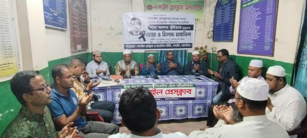 নান্দাইল (ময়মনসিংহ) প্রতিনিধিঃ ময়মনসিংহের নান্দাইল উপজেলায় দৈনিক ইত্তেফাক প্রতিনিধি মরহুম শাহ আলম ভূইঁয়ার আত্মার মাগফেরাত কামনায় দোয়া ও মিলাদ মাহফিল শুক্রবার (১৪ নভেম্বর) সন্ধ্যায় নান্দাইল প্রেসক্লাব কার্যালয়ে অনুষ্ঠিত হয়েছে। নান্দাইল প্রেসক্লাব ও সাংবাদিক সমিতির আয়োজনে ক্লাবের সভাপতি এনামুল হক বাবুলের সভাপতিত্বে এবং অর্থ সম্পাদক রফিকুল ইসলাম মোড়লের সঞ্চালনায় অনুষ্ঠানে বক্তব্য রাখেন ক্লাবের সিনিয়র সহ-সভাপতি অধ্যাপক মাহবুবুর রহমান বাবুল, নান্দাইল সাংবাদিক সমিতির সভাপতি এবি সিদ্দিক খসরু, নান্দাইল ব্লাড ডোনেট সোসাইটির সভাপতি জাকির হোসেন ভূইঁয়া, নান্দাইল প্রাথমিক শিক্ষক সমিতির আহবায়ক আমিনুল ইসলাম আনজু, সাংবাদিক আমিনুল ইসলাম বুলবুল, সাংবাদিক ফরিদ মিয়া, আজিজুল হক সহ প্রমুখ। মরহুম সাংবাদিক শাহ আলম ভূইঁয়ার স্মৃতিচারণ করে বক্তারা বলেন, সাংবাদিক শাহ আলম ভূইঁয়া ছিলেন সত্যনিষ্ঠ, নির্ভীক ও সদালাপী একজন মানুষ। তাঁর মৃত্যু নান্দাইলে গণমাধ্যম অঙ্গনে এক অপূরণীয় তি সৃষ্টি করেছে। তাঁরা মরহুমের কর্মময় জীবনের বিভিন্ন দিক তুলে ধরে তাঁর আত্মার শান্তি কামনা করেন এবং শোকসন্তপ্ত পরিবারের প্রতি গভীর সমবেদনা জানান। পরে মরহুমের রুহের মাগফেরাত কামনা করে বিশেষ মোনাজাত পরিচালনা করেন ইনকিলাব প্রতিনিধি মাওলানা হাবিবুর রহমান। উক্ত দোয়া ও মিলাদ মাহফিলে নান্দাইল প্রেসক্লাবের সাংবাদিকবৃন্দ সহ অন্যান্য সাংবাদিকবৃন্দ উপস্থিত ছিলেন।